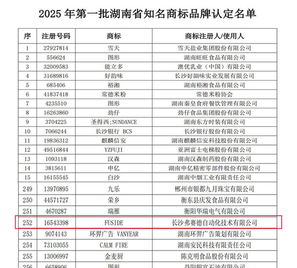 近日,2025年第一批湖南省知名商标品牌认定名单发布。此次认定中,长沙弗赛德自动化技术有限公司凭借卓越的市场表现、过硬的产品质量以及广泛的品牌影响力脱颖而出,成功入选。